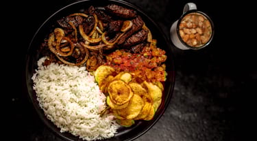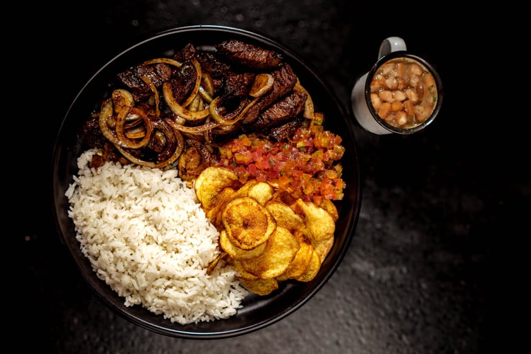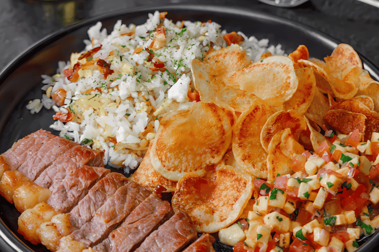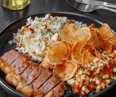 Tiras de filé mignon acebolado, acompanhado por arroz, feijão de caldo, vinagrete, farofa de alho e batata chips artesanal. Se delicie com essa verdadeira comidinha de vó.