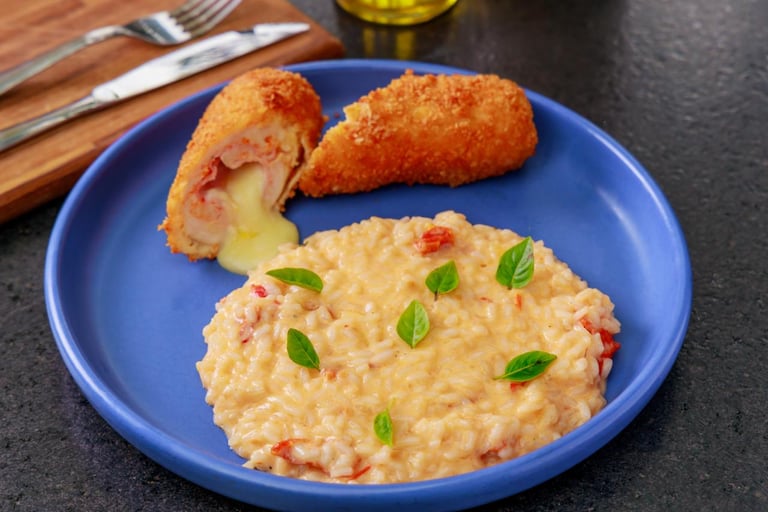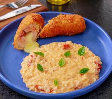 Peito de frango recheado, acompanhado de risoto de tomate seco com ervas frescas