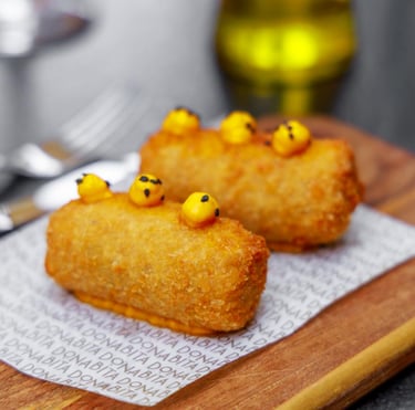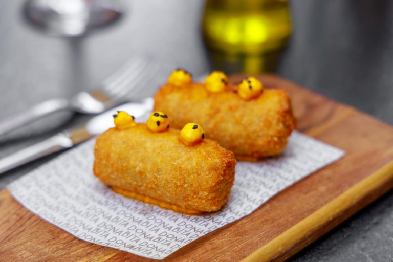 Croquetas de frango desfiado e temperado, com aioli de páprica.