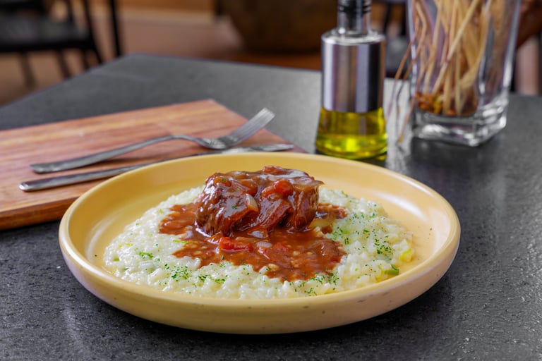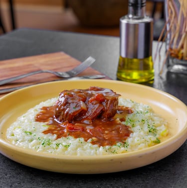 Risoto de alho - poró delicadamente preparado, harmonizando com tournedor de filé mignon regado ao nosso molho amadeirado exclusivo.