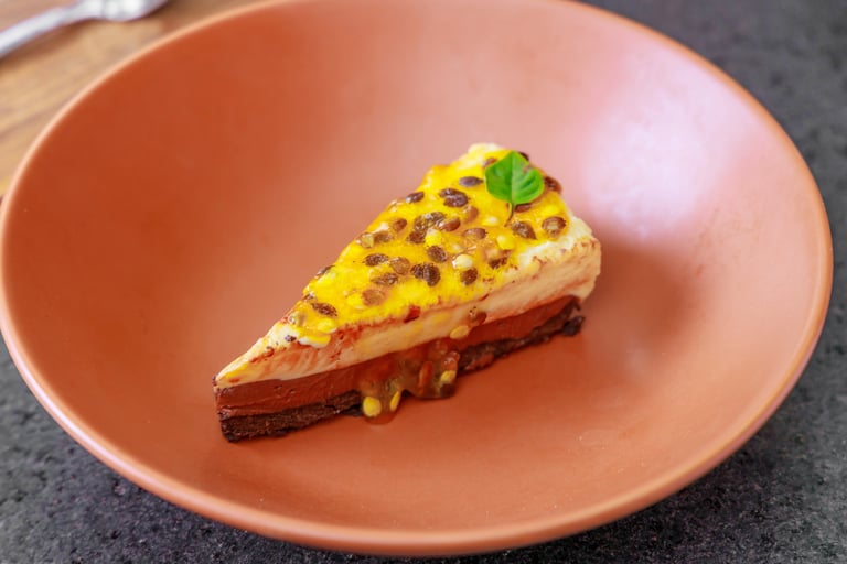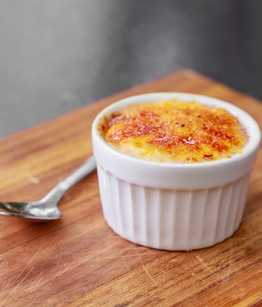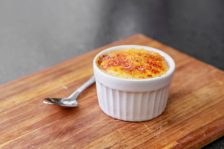 Creme clássico com caramelo queimado e geleia de frutas vermelhas.