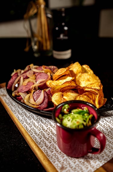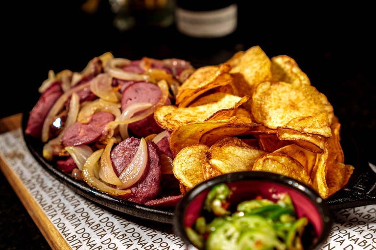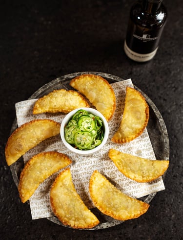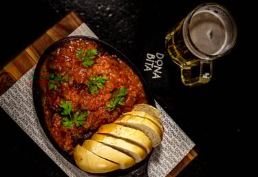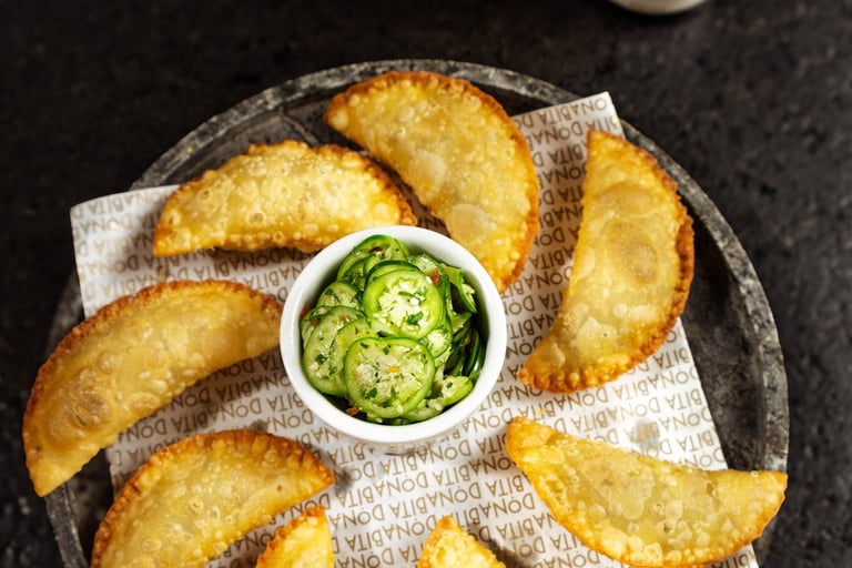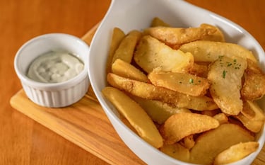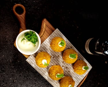Croquetas empanadas com recheio de molho de costela, acompanhadas de molho artesanal de alho e iogurte feito na casa.