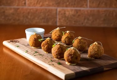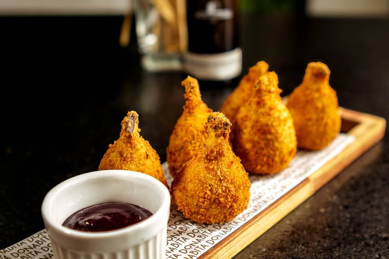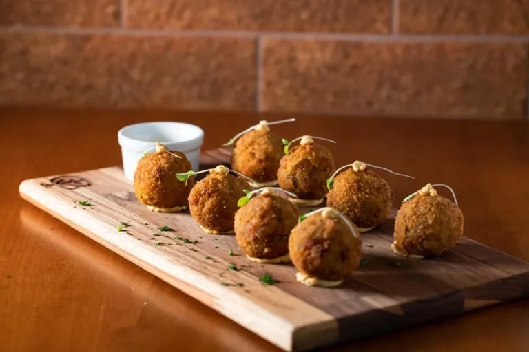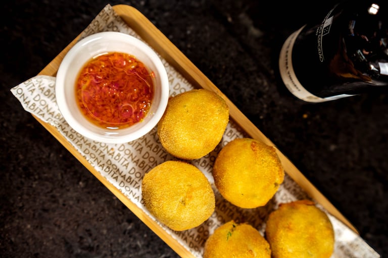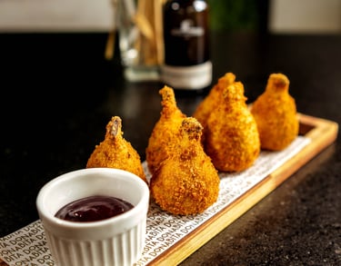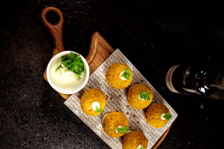 Croquetes recheadas com molho de moqueca, acompanham molho aioli.