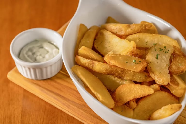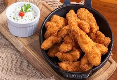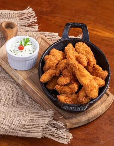 Tiras de frango empanadas na farinha panko, servidas com molho artesanal de alho.