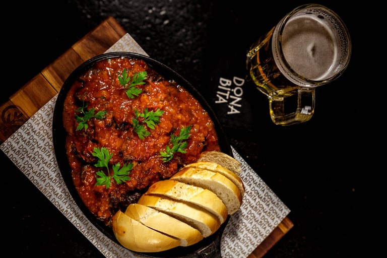 Moela cozida ao molho de tomate artesanal, servida com fatias de pão de sal.
