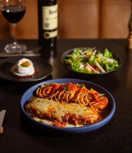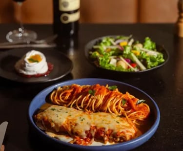 Parmegiana de filé mignon acompanhada de espaguete ao molho pomodoro artesanal.