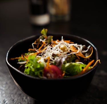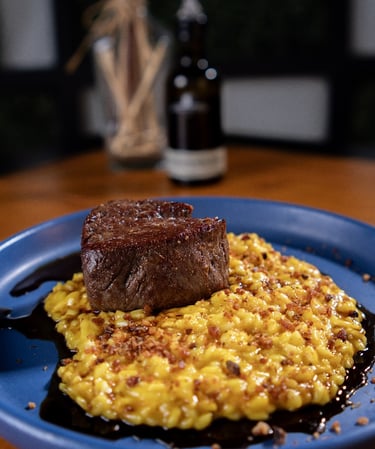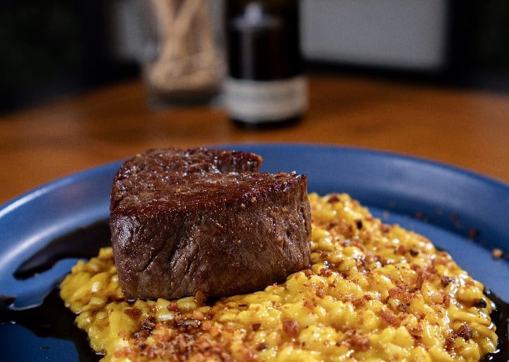 Risoto de cúrcuma com filé mignon, acompanha farofa de bacon.