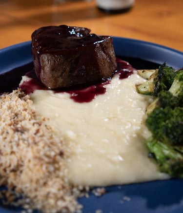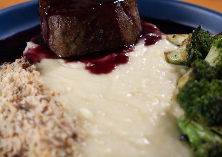 Filé mignon com aligot e brócolis, finalizado com farofa de castanha e redução de vinnho
