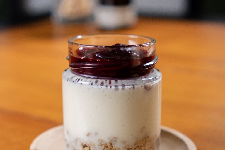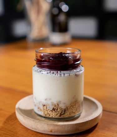Mousse de leite ninho com sablé ( farofa de castanhas ), finalizado com geleias de frutas vermelhas