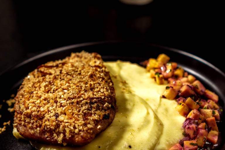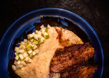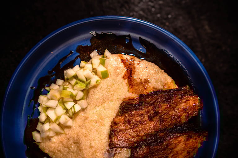 Cupim braseado servido com pirão de blend de queijos artesanais e tartare de maçã verde.