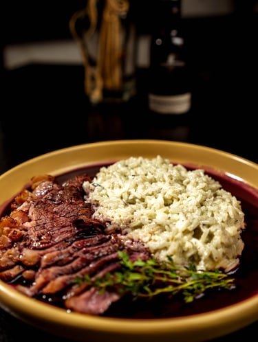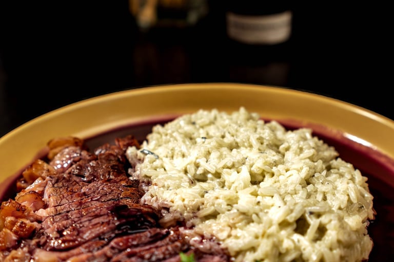 Chorizo ao regado molho de vinho tinto acompanhado de arroz cremoso de Gorgonzola.